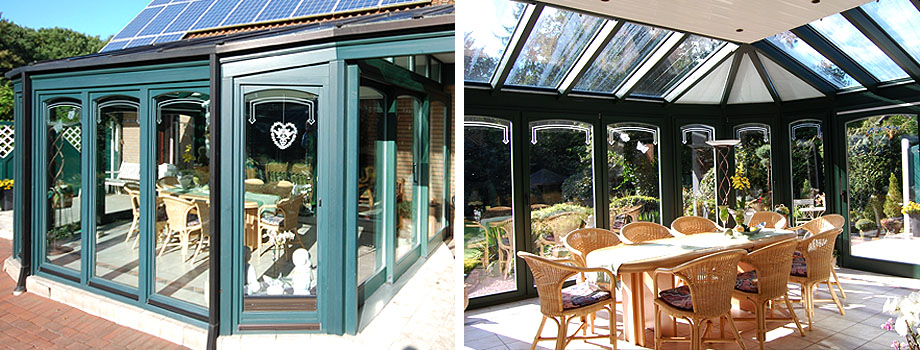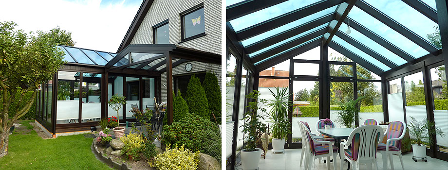Geborgen hinter schützendem Glas, ausgestattet mit entsprechender Belüftung und versehen mit flexibler Beschattung entwickelt sich der Winter-garten zur erholsamen Freizeitoase.
